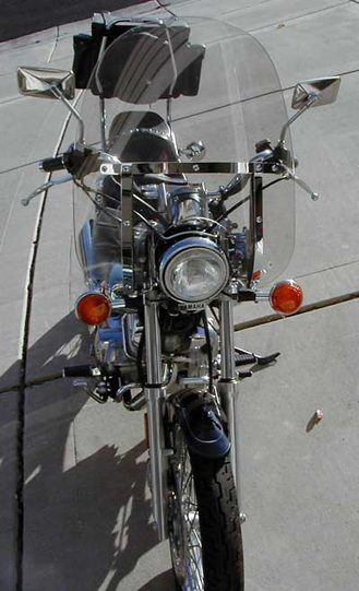 Windshield notes: It definitely keeps the wind off you! Before (with my small shield) I had to put the visor down on my helmet after reaching about 20 mph. Now I can ride visor-up until about 50 mph. The quality of the shield and mounting kit (for the 535 you need an N2304 shield and a CJI mounting kit) is excellent. The turn-signal relocation kit leaves a bit to be desired. It works, but there's a "bump" on the bike side of the turn signal mount that keeps the stock turn signals from rotating. The new brackets don't accommodate the bump without drilling. I didn't drill mine but let them sit "over" the bump. You can see that one of the signals has rotated a bit as a result. Looks like I'll be drilling. The shield mounting hardware just fits. No room for adjustment. But it is very heavy duty. (A tip: use rubber bands to hold the mount together while you get it in place.) The shield fits the bike fine with one exception: It touches one corner of the brake fluid reservoir. This is easily remedied with a piece of sticky-back foam, of which extra comes with the kit. The shield seems to have some effect on the bike's performance. There is a big difference in how much it picks up side-winds. It also seems to slow the bike some. Both are to be expected with a shield this big. It took some getting used to, but now I don't notice it nearly at all.
