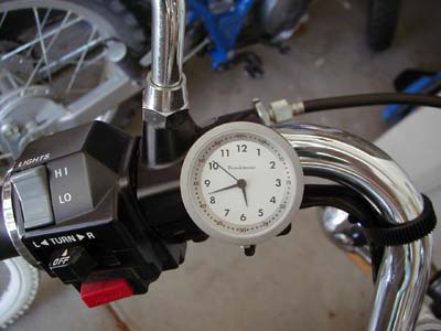 I had the bike looking great, but it sounded like sewing machine. For some people, this is great. But I wanted it to rumble! So my latest addition has been a set of Jardine slash cut pipes (more on the pipes later). Another mod has been the addition of a Priority Lites module. This converts the rear turn signals into running lights and auxiliary brake lights, without affecting their function as turn signals. Very cool and easy to install. I always wanted to add a light bar but could never find one that worked with a windshield. Almost forgot! First thing I wanted to add was clock. I ride to work and need to know what time it is. Good luck finding a clock for a motorcycle. I can't understand why no one makes a reasonable one. All I found was an expensive and bizarre piece for a Harley that fit on the fork cap. It was a chrome bezel with a watch stuck in it, and it wasn't even a waterproof watch! Duh! So I made my own. Click here to go to the motorcycle clock page.