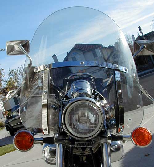 But, I started modifying it as soon as I got it. XV535 accessories are hard to find. I wanted to dress it up and I needed more storage. Saddlebags are hard to fit the stock bike (at least with any capacity). So I decided to go with a tail trunk. I ordered a tailbag from Chase-Harper (a Super Sport Tail Trunk), but frankly it was junk. I exchanged it for another Chase-Harper model (the AeroPac) and while this was better, I still wasn't happy with it. I looked at the rack from Yamaha, but it was useless with a 6 pound payload rating and expensive as you had to buy their utterly worthless sissy bar in order to mount the rack. I ended up with a cool rack system from Ventura. It works great and provides passenger hand-holds too. The bag they sell with it is fine, but not really styled for a cruiser. A fellow rider was selling an Ameritex studded trunk bag so I got that and adapted it to the Ventura rack with some webbing and clips. It's not yet perfect, but it works. (Note: Ameritex makes two models of this bag (also comes in a few sizes). The one I got slips over a sissy bar and won't slip over the Ventura rack. But they now make a "universal" mount that attaches with wide velcro straps and this fits the rack fine with no mods necessary. So if buying new, get this version.) To dress the bike up I went with the Yamaha Custom studded seat (which turns out is made by Corbin) and their studded tank cover. I added a small after-market windshield to catch the major bugs and make it easier to ride on the freeway. It helped immensely and is fairly unobtrusive. (Note: This windshield cracked and I have just replaced it with a National Cycle Dakota. Pictures and review below.)